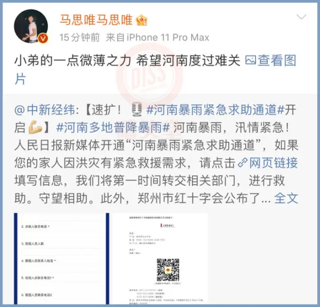 马思唯向河南灾区捐款!个人捐出20万元。