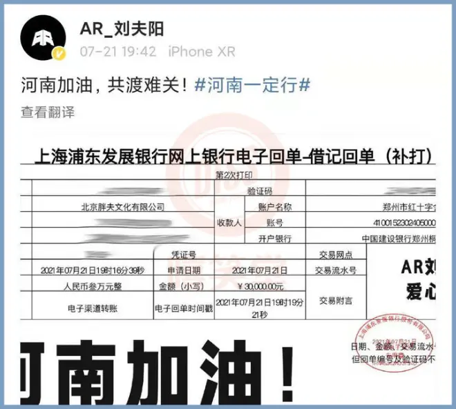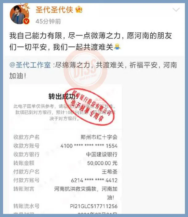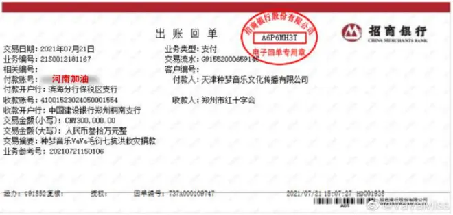 黄子韬代表公司和全体艺人向河南灾区捐赠300万元。
