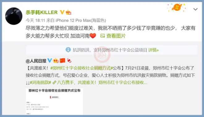 李昂向河南灾区捐款2万元,杀手耗也进行了捐款。