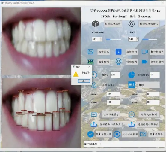 再点击图像检测按钮可完成输入图像的目标检测功能,之后系统会在用时一栏输出检测用时,在目标数量一栏输出已检测到的目标数量,在下拉框可选择已检测目标,对应于目标位置(即xmin、ymin、xmax以及ymax)标签值的改变。