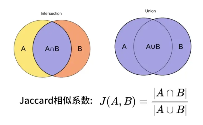 Jaccard相似系数可以用来比较有限集合之间的相似性与差异性。设已知两个集合A、B,Jaccard 系数等于A与B交集的大小和A与B并集的大小的比值。