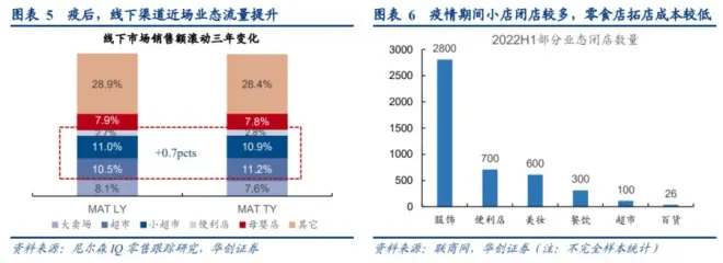 供给端:疫情期间享点位红利,供应链规范标准、提效明显。零食量贩社区店为主,疫后部分餐饮/奶茶店铺资源空置,而窄门餐眼数据显示,疫情下仅 500-1000 家左右门店规模的卤味店闭店率达 40%,租金低位,疫情管控本身也导致一二线城市的小店主返乡再就业,零食量贩店通常不需要专用设备,门面改造起来更容易;且零食上游建立了规范标准的体系,集合店回款迅速、无账期,产销效率均有提升。而门店管理规范,大店趋势明显,店内散称为主,一站式购齐,亦为消费者提供了更多“逛”的优质体验。