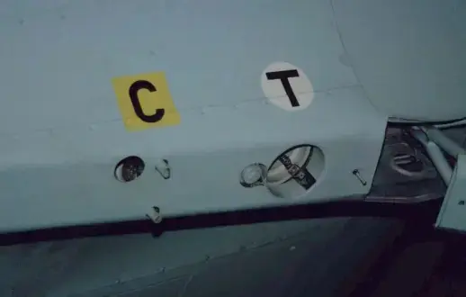 回答:实际上在机身上写的大写的T字母和大写的C字母分别代表的是Me 163B“彗星”上80%过氧化氢水溶液燃料加入位置(用大写的T表示)与和甲醇—联氨水溶液燃料加入位置((用大写的C表示) ),不过从第三张图中就可以看出Me 163B“彗星”上80%过氧化氢水溶液燃料加入口位置与和甲醇—联氨水溶液燃料加入口位置,不过这些加入口的上方都会用金属罩把他的加入口罩住,如果要给Me 163B“彗星” 加80%过氧化氢水溶液燃料的话,要把在机身上写有大写字母T位置的80%过氧化氢水溶液燃料加入口给Me 163B“彗星” 加80%过氧化氢水溶液燃料的操作,如果要给Me 163B“彗星” 加甲醇—联氨水溶液燃料的话,要把在机身上写有大写字母C的金属罩子向机身后方推去,在进行下一步给Me 163B“彗星” 加甲醇—联氨水溶液燃料的操作
