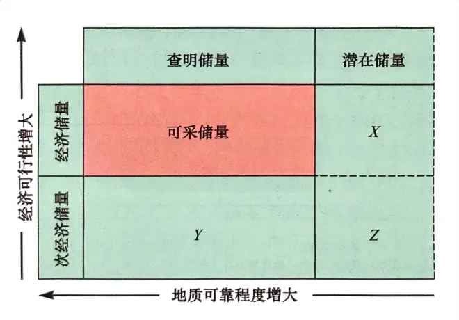 不过,对于任何一种资源的储量可以按照下面的方法进行估计。图中最大的矩形代表某种特定资源的总储量,已探明和发现的资源数量称为查明储量,尚未查明的称为潜在储量,现有技术可以利用的称为经济储量,由于各种原因尚无法利用或很少利用的称为次经济储量。已查明并且在现有条件下可以开采的资源熟练称为可用储量,如果发现了新的可开采资源储量,它就会向右移动,如果改进了利用方法则会向下移动。