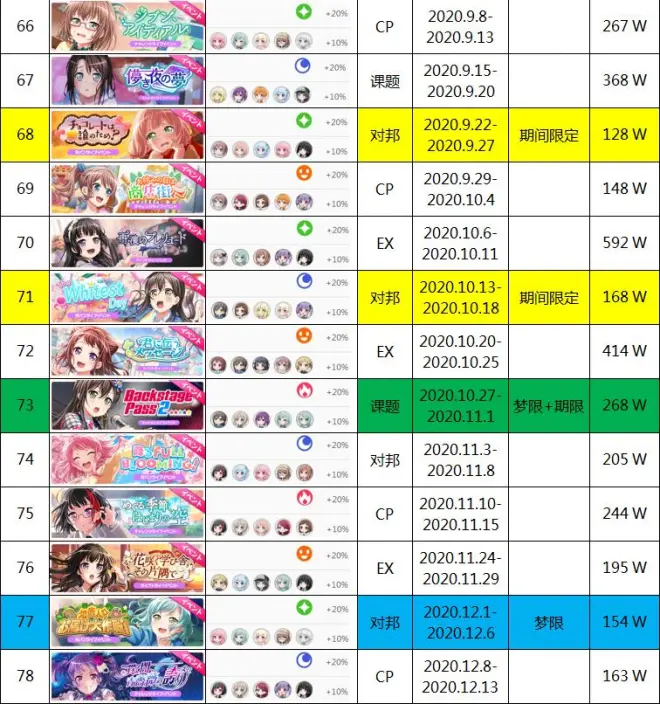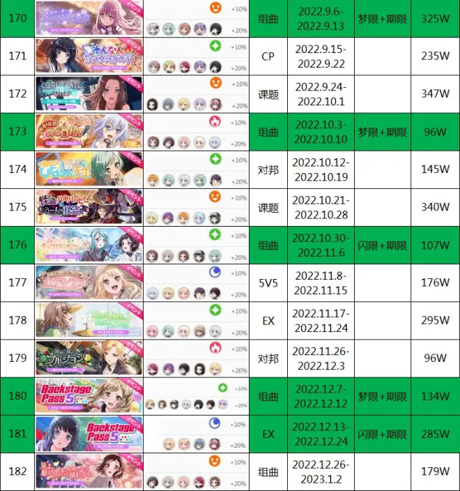 活动备注为卡池情况并用颜色区分,包括期限(期间限定)、联动限定、梦限(梦幻FES限定)、闪限(Kira FES限定)。从164期活动开始,平均每3期活动有1期FES(约等于每月1FES)。国服预计11月初将实装5星卡,零充党和微氪党可根据情况调整抽卡规划。