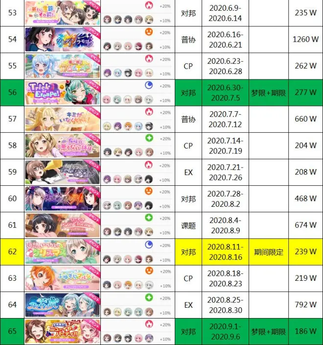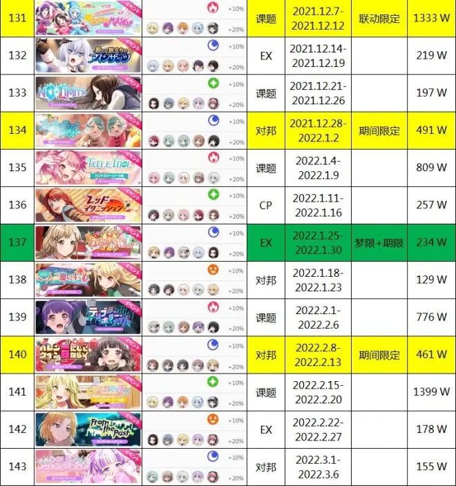 活动数据参考日服活动信息整理,数据来源bestdori。活动列表仅供参考,请以官方信息为准。