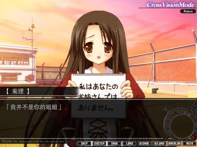 游戏的全称为11eyes~罪与罚与赎罪的少女,其中的11eyes已经介绍了,是基于已经成为神的菊理的天使的能力,能够看到过去和未来,包括他人的主观视角,游戏里则表现为Cross Vision多重视角系统。
