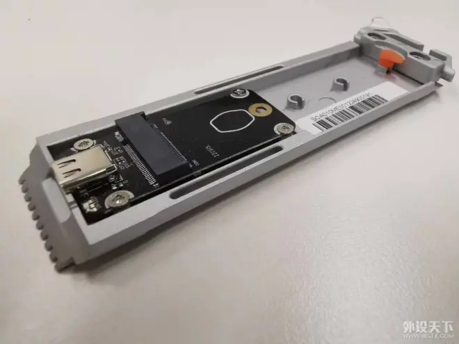 硬盘盒本体也是2块铝CNC的,采用了无螺丝设计,用硅胶钉固定,更换硬盘很简单就能操作,不需要到处找螺丝刀了。硬盘底座兼容2280、2260、2242、2230四种尺寸M.2固态硬盘,橙色的小部件是硬盘固定卡扣,硅胶材质,一按即可固定。