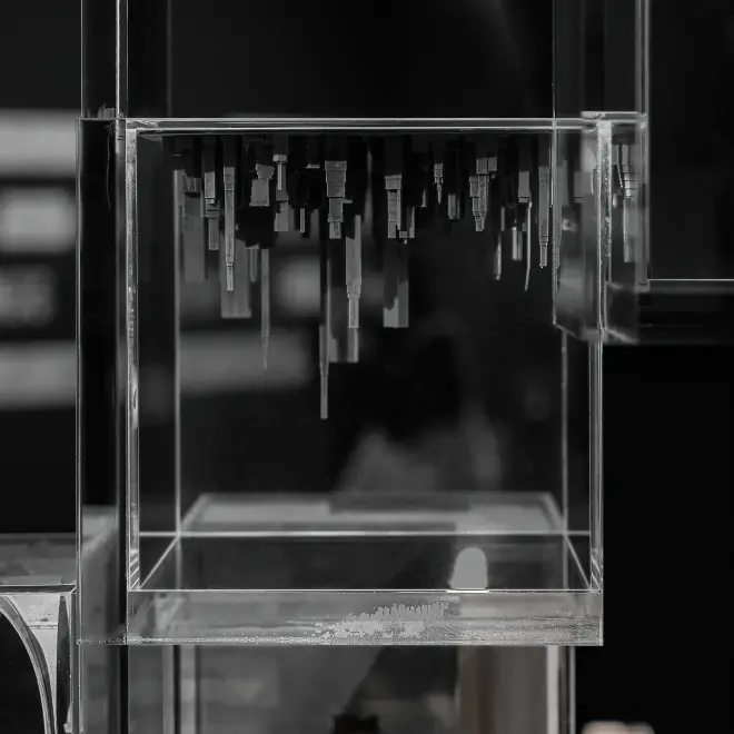 该作品试图从现代垂直城市中获得原型,在方寸间(投影0.9 X 0.6米)以小见大,架起一道从现实城市空间到潜意识之间的桥,在现实生活与我们的心灵之间造成一组混响。