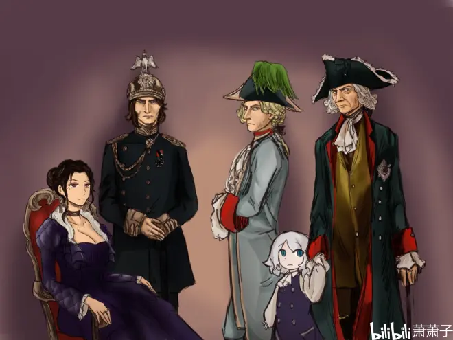 “请您在迎宾厅稍作等候,王妃和公主殿下马上就会来。”随后萨莉亚便走进了宫殿深处。爱丽丝便在这接待厅四处张望,首先便注意到侧对着门的那面墙上画着一张全家福。画像最右边的那人正是那位即使在这种场合也依旧保持着严肃的威廉-弗里德里希二世,不,不止是他,照片里所有人都神情庄重,除了他牵着的那个懵懂少女,长着与他一样的白发和有些异样的瞳孔。少女只够得到他的腰,看上去不超过十岁,想必就是公主。公主用纯洁的眼神望着自己的父亲而非画面镜头这边。