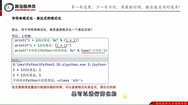 - 通过语法:f"内容{变量}"的格式来快速格式化 f作为标记写在前面