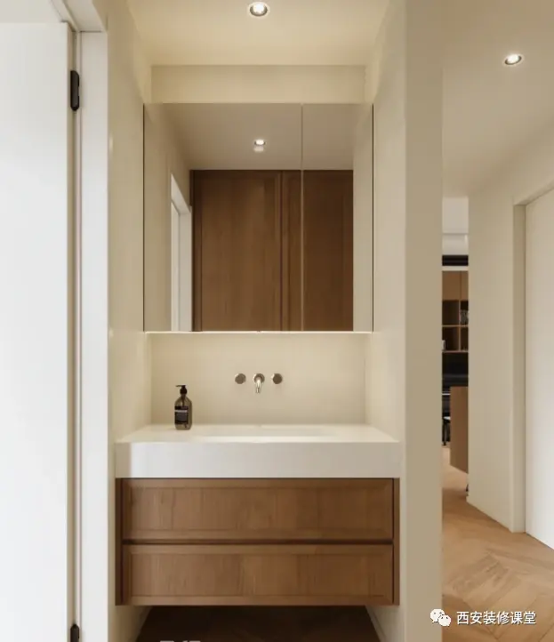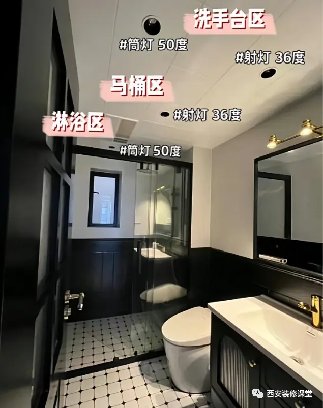 ▲特别是暗卫空间,除过颜色以浅色外,灯光显得尤为重要,是最好能改变光线的渠道了,所以尽量不要做网红灯具,一定要务实满足功能,目的是为了照亮小空间,让小空间更明亮,而非花里胡哨的做法《干区灯光功能第一,氛围次之》