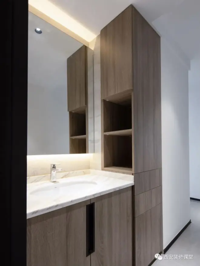 ▲当然你想要美美的镜子不是不可以,而是以满足收纳为前提的,如图可以采用收纳柜代替墙体,然后你可以用美美的镜子,而非一味的东施效颦,造成后期入住收纳不够翻车《洗手盆挂镜子好看,你得有条件》