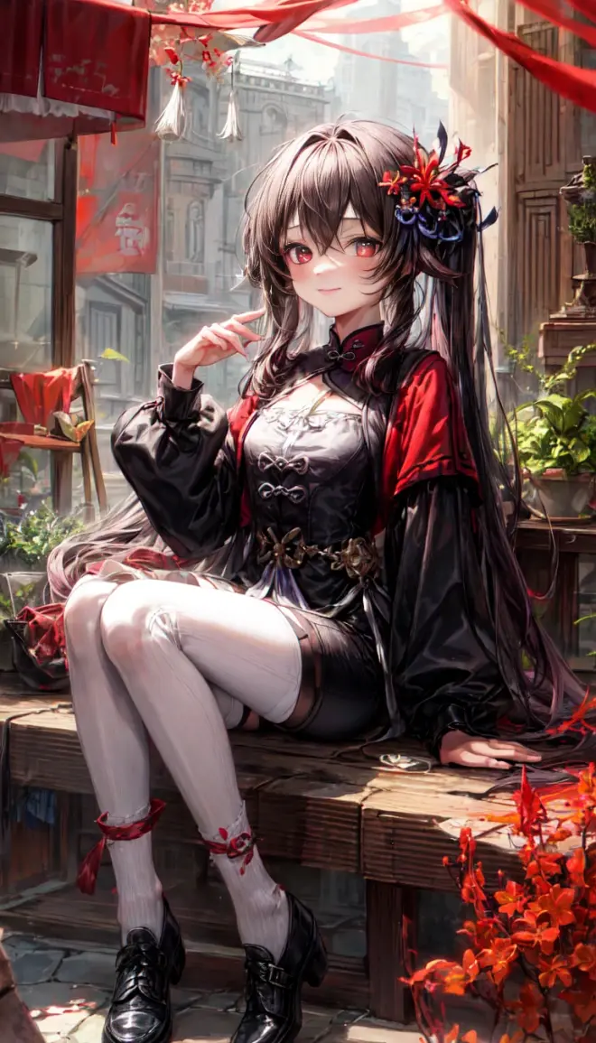 1.端坐着的胡桃,看到旅行者之后特意给TA腾出了位置。(ps:这白色瑜伽裤是什么鬼啦!!不过有一说一,这张的手是画的最好的,当然,只有右手)