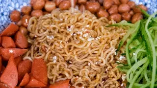 做法真的很简单,火腿肠煎过之后变得外脆焦香,和黄瓜丝、花生米一起码在泡面上,最后淋上特制的料汁,拌一拌就能开吃!看一遍就会的做法,但味道却超乎想象。