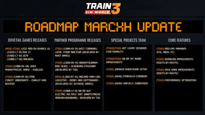 在线路图发布前,我们已经为ScotRail Express: Edinburgh-Glasgow推送了Rivet Games制作的修复补丁,补丁内容可参查阅此处了解更多信息(https://forums.dovetailgames.com/threads/update-notes-7th-march-edinburgh-glasgow-post-release-patch.65698/)。在1月的线路图直播中,我们同Rivet Games宣布了West Cornwall Local Steam Railtour,现在我们确认该DLC将于本月发布!