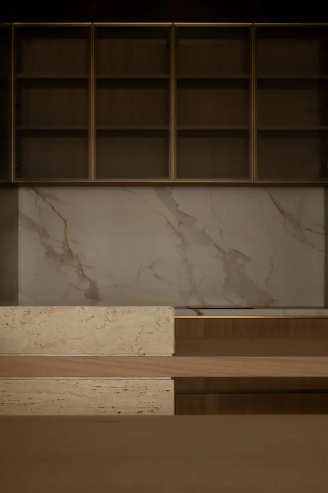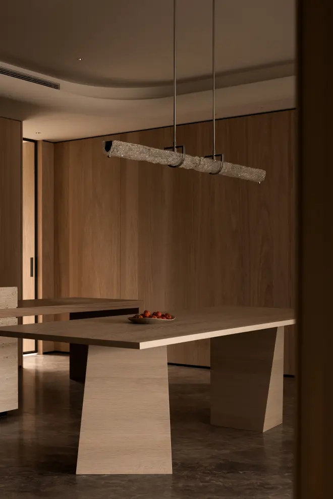 功能规划上对原户型存在的私密性弱,廊道过多等问题进行了优化,充分释放空气的流通性、合理提高自然采光和景观的利用率,以及通过三重中轴玄关大幅提升空间体验的仪式感和品质感。美学形式叠合功能,以暖系基调叠合自然肌理,拼接利落线条,简饰意奢元素建构空间,使之呈现出一种持守风雅、尺度、审慎连接的品质生活型格。