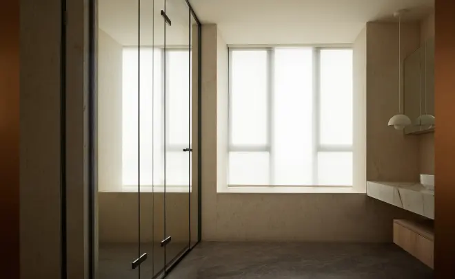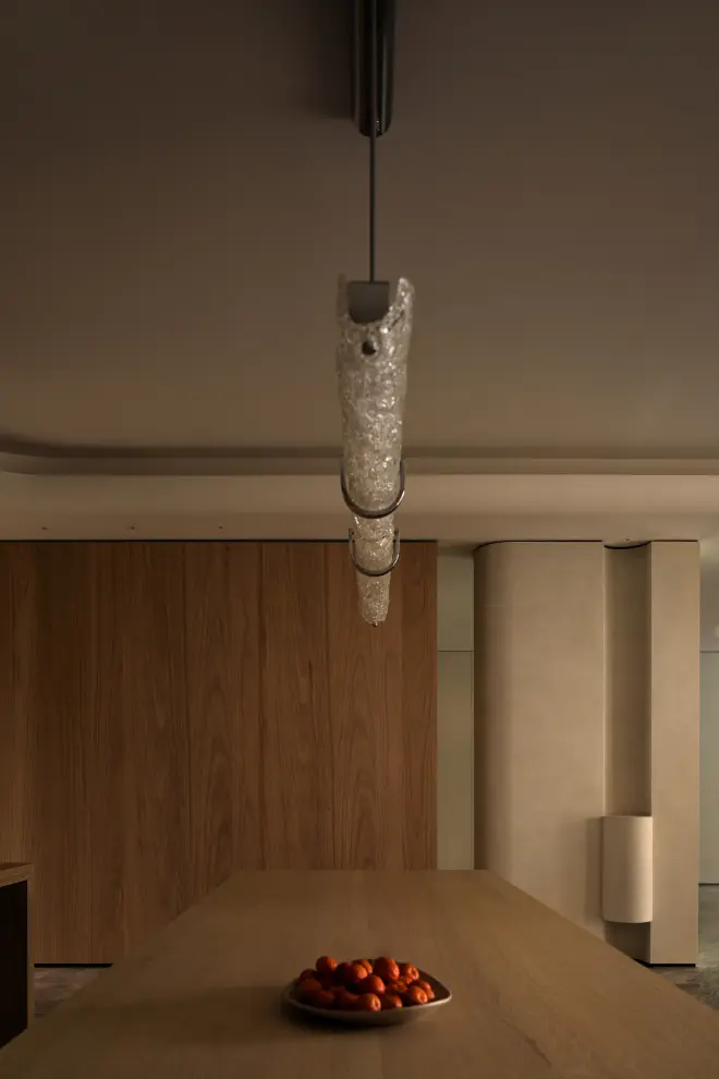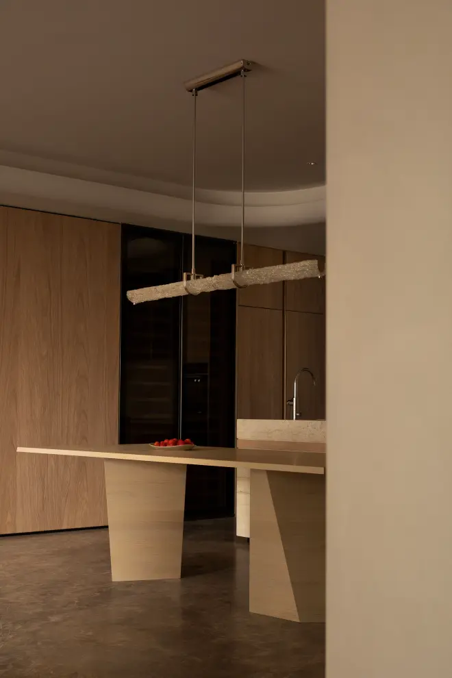 设计师将整体空间设计为动静两区。动态区域由双梯入户且带有衣帽间的玄关、中西双岛台厨餐区、一体两面的墙柜自然分置的客娱区、以及可开合自如的双露台组成,主要满足生活日常和社交。静态区域则由男女主人收纳服饰的衣帽间,连通江景主卧、功能完备的主卫以及不扰休息的办公区,四区合一,形成服务于主人休憩、互动、处理工作等情感生活需求的套间。
