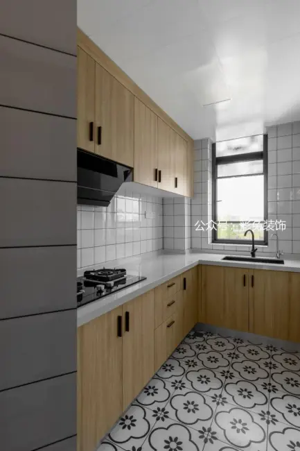 厨房和生活阳台打通后,操作平台拓展到窗下,能容纳两个人轻松下厨。橱柜门板选原木色,搭配地面小花砖,更有一种天然温馨的氛围感,给做饭人带来好心情。