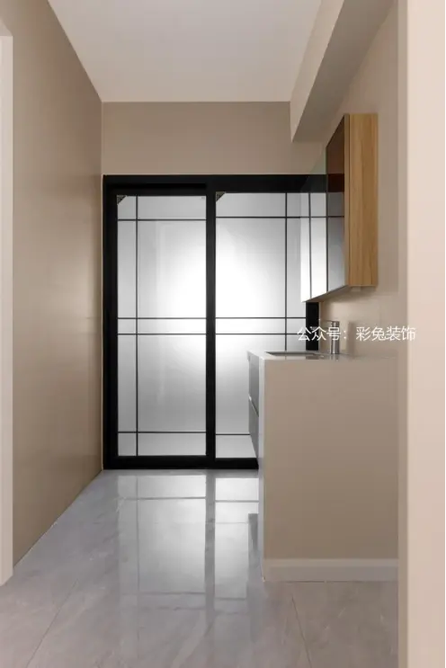 卫生间洗手台移出来,用半墙和过道相隔,走廊空间更显宽敞。卫生间用推拉双开门,增加空间的通透性。