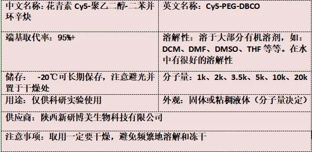 Cy5-PEG-DBCO应用于医学研究、药物释放、纳米技术和新材料研究、细胞培养。在配体、多肽合成载体、接枝聚合物化合物、新材料以及聚乙二醇改性功能涂层等方面的活性化合物的研究。