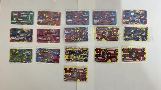 那时候2008年,我还是个小学生,在四年级的时候最先接触到的是这套跑车拼图卡,这套跑车拼图卡在我们这边特别火,几乎全校都在玩,而我是全校玩这个玩得最狂热的,没有之一,经常饿一周剩下零花钱去买方便面,甚至直接一整箱都买过,当然,我也是全校唯一一个集齐全号码的人。