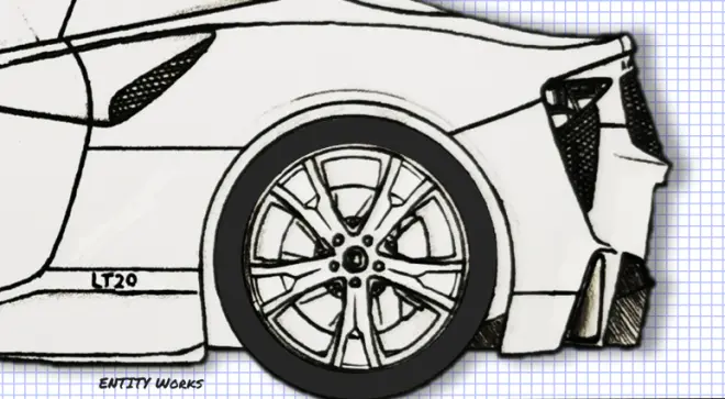 相比于VRT36,LT20的侧面造型改变不大。除了新的黑色复合材料车顶和后视镜基座,造型经过轻微改变的轮毂也属于变化的一部分。刹车经过调整以适应变更的车重;也是由于性能要求的降低,车身侧面为后刹车提供冷风的进气口被取消了。LT20所表现出的隐忍风格很合适作为VRT36的“青春版”。