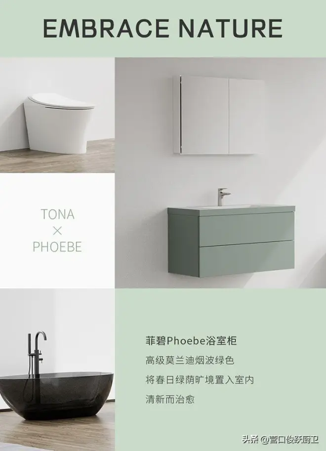 戴安娜Diana浴室柜,独一无二的烟灰绿,在绿与白的碰撞中 春天的自然秘境于室绽放,自然细腻的触感肌理 精美易用的台盆,于悠然、静谧中尽享纯粹惬意。