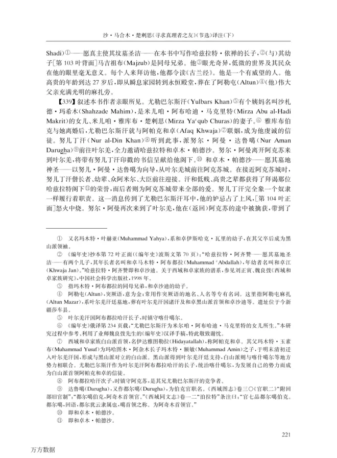 《寻求真理者之友》是《编年史》作者沙.麻赫穆德.楚剌思的另一部作品,至早写作于1694年及以后(因为文中提到了1694年即位的阿克巴锡汗)。 《寻求真理者之友》是有关于叶尔羌汗国晚期宗教发展和内战的重要一手史料,本文章内的图片来源于学习通软件上的图书馆邮件传递截图。