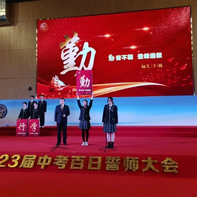 南京市第一中学初中部校长孔北京向初三年级各班赠字:“勤”“学”“行”“争”“搏”“冲”“聚”“炼”“竞”“实”“扬”“航”“前”“进”“成”“赢”,班级代表上台带领本班同学喊出相应的口号,气势如虹。
