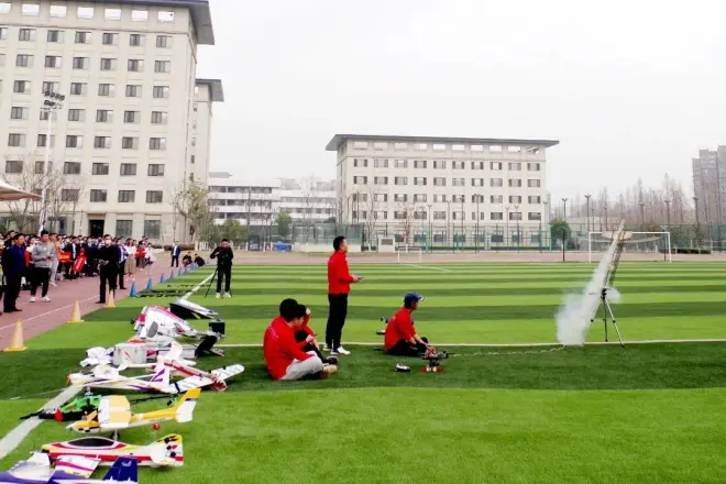 全体师生齐唱校歌,后移步到操场观看航模表演,这是南航航模队和一中共建的社团课程。南京航空航天大学长空航模表演队用这种形式展示航空运动。