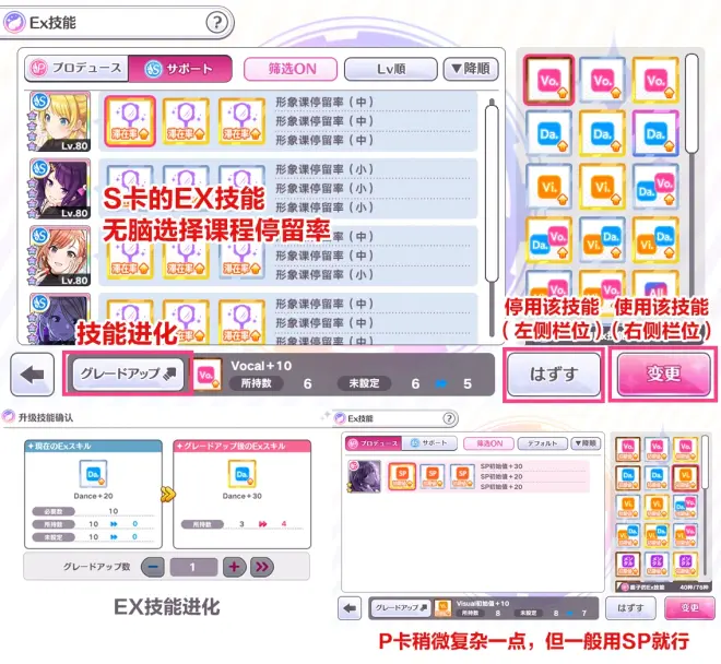 每位偶像可以获得大量的EX技能,通用于她的所有S卡,不过每单个技能只能用在单张卡上,组合的时候还请注意