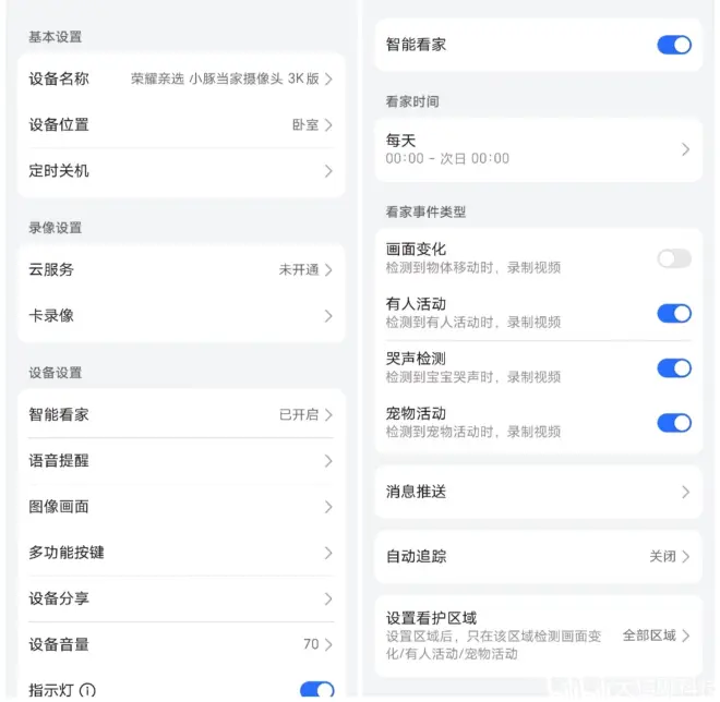 AI看护功能:监控摄像头不仅仅被用于监控清晰度的画面外,还要有更多的功能与智慧生活的今天相匹配,例如辅助看护宝宝、看护宠物等功能,那荣耀亲选小豚当家摄像头3K版就带来了我想要的这一系列AI高精准看护功能。