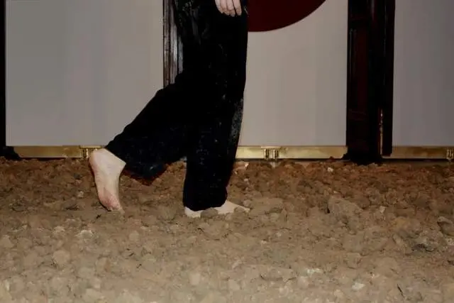 本场展览在过云楼五进三落的空间中徐徐展开,艺术家通过作品和古建筑之间的多个对应关系,构建出穿越时空、地域、人文等多维度的立体对话场域。例如,二进院、三进院皆有出现的塑料材质白色草坪,呈现了当代世界和古代世界的对话,艺术家通过象征乌托邦般存在的人造物,寄予了一种洁白而美好的东方诗意愿景。在二进院展厅地面中心,艺术家戴莹以当地土壤为材料带来全新空间装置作品,巨大的方形土壤与墙面上诸多方形绘画之间交相呼应地交流着。土壤的寓意尤为厚重,跟建筑、生命、在地有着根源性的连接。当地土壤埋葬了这里的过去,也孕育出万物和未来,代表生命的开始和结束,而艺术家过往画作和全新系列似乎也共同回应着这样的生长与轮回。在展览开幕当天,艺术家戴莹以行为艺术的方式特别演绎过云楼“恍然月白”。她在泥土中不断抓取、放下,以悲悯的气场充满整个空间。这一行为也是对其2020年雕塑装置作品《绵延》的一次全新升华。值得注意的是,处于土壤之上的两根建筑柱子,其中一根被特意以镜面材料包裹,和另一根保留古建原本面貌的立柱也形成了彼此的对话。墙面上生锈的圆盘装置如一轮圆月,见证着展厅中的一切存在,诉说着艺术家关于“恍然月白”的更多哲思。