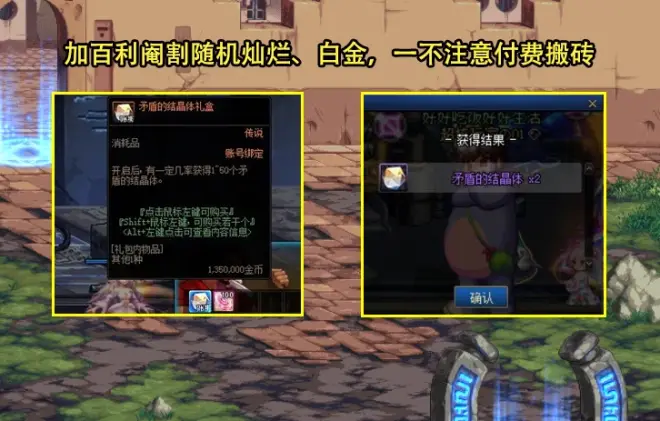 韩服加百利售卖的“随机灿烂”,“随机白金”也是惨遭删除,变成了矛盾礼盒,矛盾礼盒打开后可随机开1~50个,少于17就亏,搬砖少了惊喜不说,一不小心还容易造成“付费搬砖”,简直难绷。