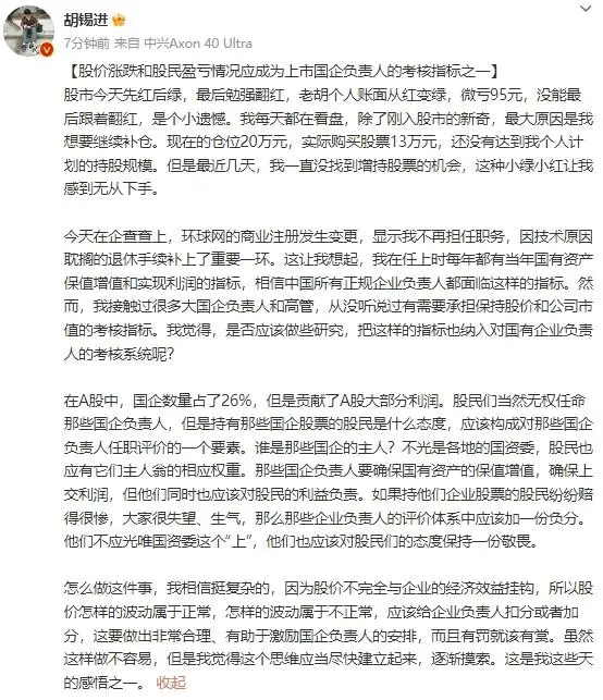 胡锡进今日发表炒股心得:在A股中,国企数量占了26%,但是贡献了A股大部分利润。股民们当然无权任命那些国企负责人,但是持有那些国企股票的股民是什么态度,应该构成对那些国企负责人任职评价的一个要素。谁是那些国企的主人?不光是各地的国资委,股民也应有它们主人翁的相应权重。那些国企负责人要确保国有资产的保值增值,确保上交利润,但他们同时也应该对股民的利益负责。如果持他们企业股票的股民纷纷赔得很惨,大家很失望、生气,那么那些企业负责人的评价体系中应该加一份负分。他们不应光唯国资委这个“上”,他们也应该对股民们的态度保持一份敬畏。 胡锡进卸任环球时报旗下公司职务 天眼查显示,近日,环球时报在线(北京)文化传播有限公司发生工商变更,胡锡进卸任副董事长,由范正伟接任。该公司成立于2009年6月,注册资本5000万人民币,由人民网股份有限公司、《环球时报》社有限公司分别持股60%、40%。此前,胡锡进任职环球时报旗下公司引发关注。胡锡进对此回应称,自己在2021年底退休,环球时报社未能及时对其担任职务的环时下属公司及参股公司做商业注册变更,会加速办理。