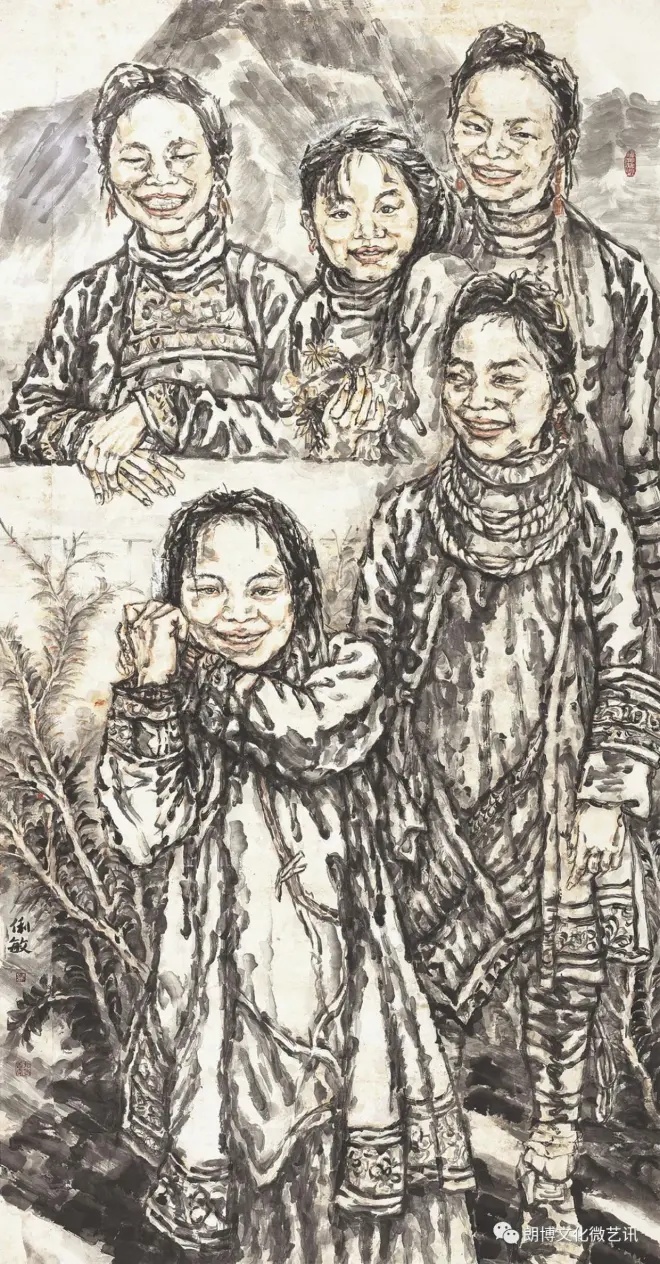 盘俐敏的作品具有鲜明的“辨识度”,其中,最为画坛所关注的是她的水墨瑶族人物画。她的瑶族人物画主要不是以题材取胜,更不是以极尽能事地描绘繁缛的穿戴服饰来吸人眼球,而是以深挚的情感和独特的线性用笔与水墨特质来表现特定民族、特定社会角色由外而内的精神风貌,使作品呈现一种沉厚、苍涩而又新奇的意境。