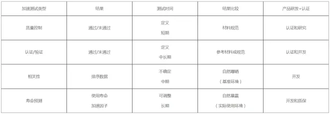 这是耐候老化测试最关键的问题之一,目前没有任何一个测试方法可以通用的帮助企业解决所有问题,同时,测试结果的解释通常由客户决定。但是,我们可以根据收集的信息类型提供一些有关加速测试选择的指导。在这里,美国Q-Lab公司提供了一个不同的老化和腐蚀加速测试类型矩阵(见表1),可以帮助在耐候老化测试中指向正确的方向。