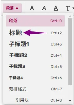 段落:选择文本的格式,主要使用的分为标题和正文两种。我们一般在编辑中不使用“页面标题”,因为页面标题系统会自动置于顶层,重复页面标题会显得有些多余。若是要使用标题,可以使用下拉的第二个即可。