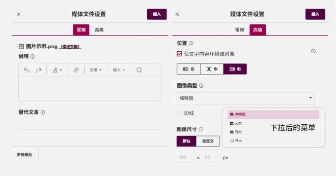 插入图片或媒体:点击后可以选择搜索/上传图片并使用。搜索图片这一功能仅限于该wiki内。例如,搜索一张“猫”的图片,可以找到wiki内名称带有“猫”的图片,但不能找到百度上与“猫”相关的图片。