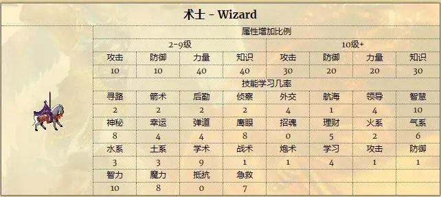 术士的职业技能是10%的智力,毫无疑问,这是每一个希望做主力的法系英雄都爱的技能,搭配术士极高的初始知识和成长率,很容易就形成深不可测的法力池,另外,学术虽然是炼金术士的普遍技能,但术士也耳濡目染达到最高的9%几率,魔力也是8%的高概率学习,但很明显,术士老爷们四体不勤,不仅进攻术,箭术,防御术,战术纷纷垫底,后勤术也是全职业最低的2%,但好在术士们的气系魔法排名第一,高达6%,依靠浑厚的法力值做异次元移动才是正道吧。