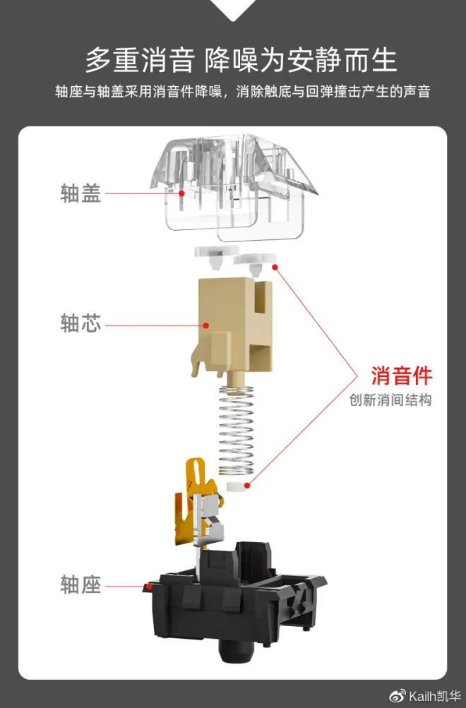 区别于之前的BOX轴结构的静音系列轴体,夜阑轴是凯华首款MX结构且采用的是防尘壁导心设计的静音轴体