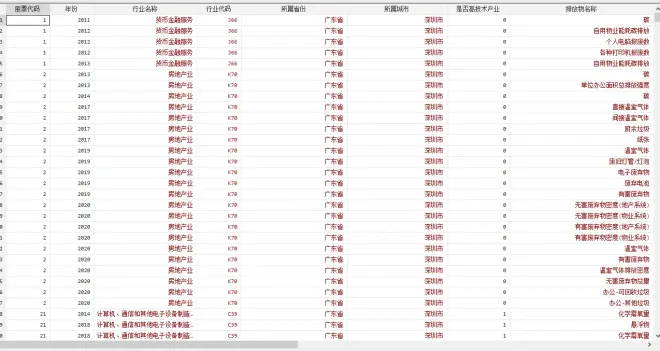 数据指标:股票代码、年份、行业名称、行业代码、所属省份、所属城市、是否高技术产业、排放物名称、排放量、单位