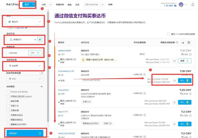 小提示:汇率忽略,小额交易不用考虑汇率,找个能卖的卖家就行,让他发微信账号,你扫码付完款之后,点击已付款,卖家会点击完成交易。USDT会自动到你的paxful账号里。
