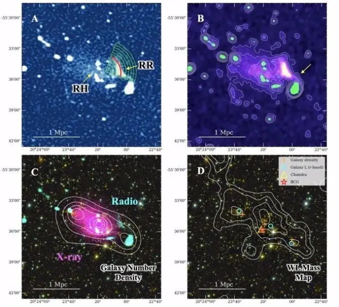 它们以壮观的单对称弧或双对称弧形式出现在星系团的外围。天文学家特别感兴趣的是在合并星系团中发现这样的来源,因为与合并冲击相关的射电遗迹数量仍然很少。