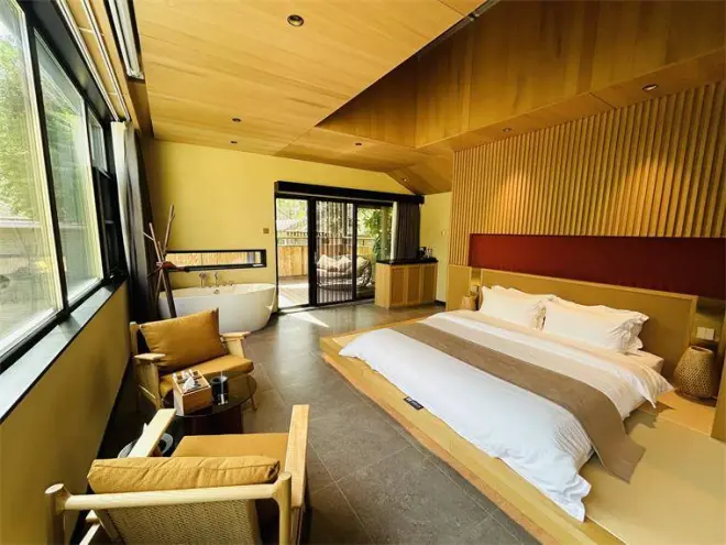 房间设施:包院客人独享,共有三间客房,可容纳6到7人!三室两厅,独立餐厅,一层属于庭院家庭套房,二层(星空情侣套房)整体装修日式风格,房间视野通透,冬日全屋地暖,夏日冷气空调,全屋智能控制,全wifi覆盖,设有KTV房,桌游棋牌室,星空浴缸套房,休闲露台…尤其卫生细节很好呦!光是自动马桶这件事,敢说就有很多五星级酒店都做不到的,床品以及床垫都是非常柔软!