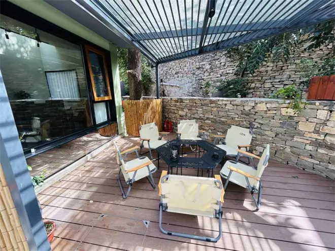 整体民宿的设计; 从进门之前的小胡同就已经感觉非常幽谧和静寂,白天可以看到四周的花和树,晚上有小路灯不会觉得不安全或太暗。进入院子的铁门有密码设置,院子里有烧烤,餐厅里有餐桌和麻将桌。