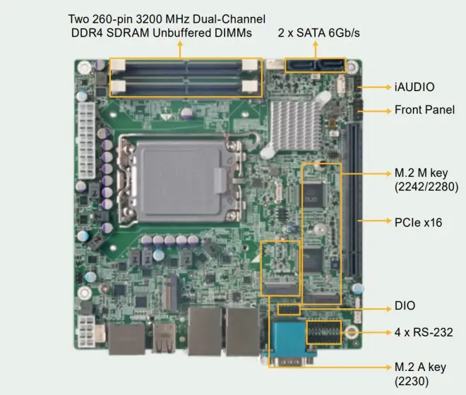 IMBA-ADL-H610支持的处理器范围广泛,包括LGA1700插槽的Intel® 第12/13代的Core™ i9/i7/i5/i3处理器,Pentium® 处理器以及 Celeron®高性能处理器。搭配双通道DDR4内存(最高可达3200 MHz频率,最大可选64GB容量),为您的运算提供强劲动力。