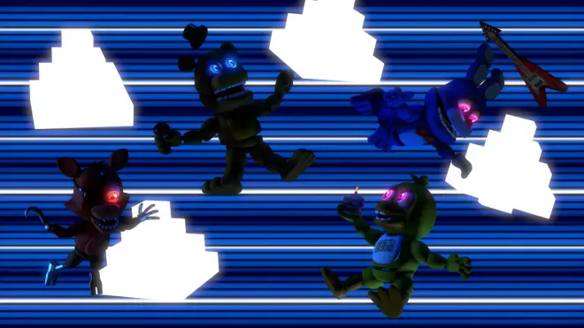 “邦尼!玩具奇卡!”奇卡、弗莱迪、霍斯和弗雷熊叫喊着,可是却无能为力。其他人则是看都不敢看。