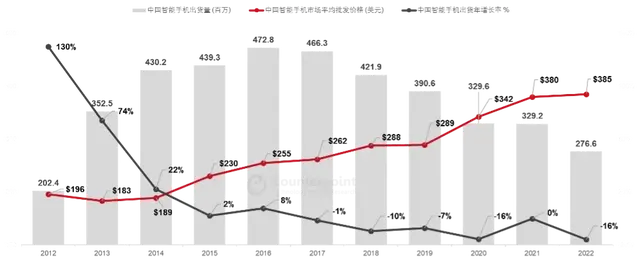 2022年,中国智能手机批发均价达到了385美金,价格高于500美金的产品销量占比达到了26%以上。